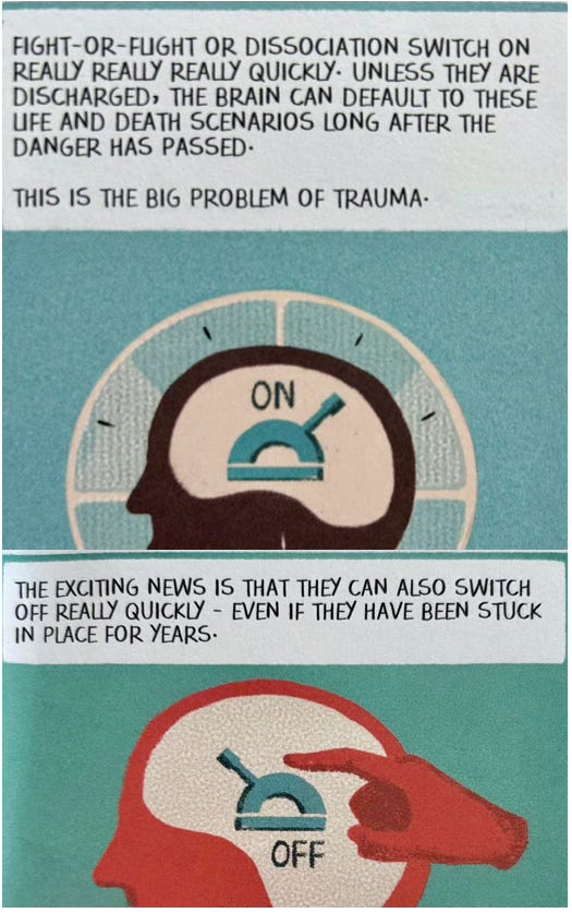 ‘Trauma is Really Strange’ is a graphic book and is part of a boxset (The ‘Really Strange’ Boxset) written by Steve Haines, a bodyworker with a special interest in pain, trauma and anxiety (you can read more about him here). The artwork is by Sophie Standing, who specialises in health illustration (you can read more about her here). The book was perfect for me while I was in a place of trauma, because it breaks everything down simply and in the form of beautiful illustrations, which I found easy for to focus on and take in. For me, when experiencing a trauma response, it is almost impossible to focus on anything, and reading a complex book or listening to complex information is far beyond my capability. This book, however, got through to me, at a time when I was finding it difficult to move forward.